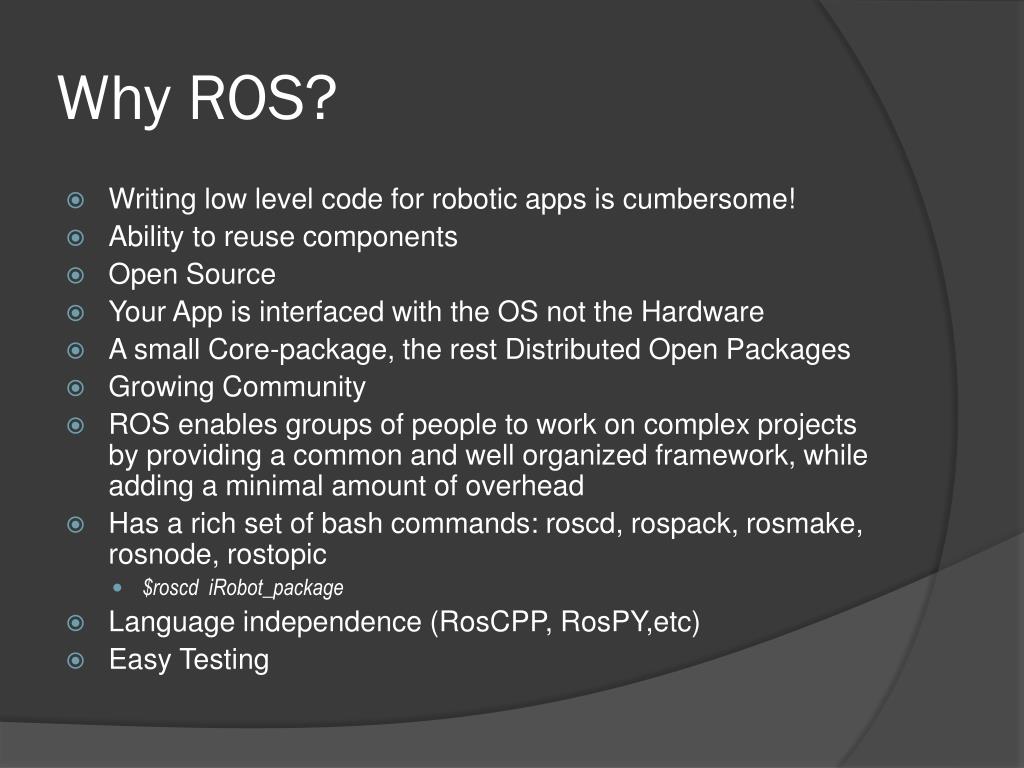 Why ROS? • Writing low level code for robotic apps is cumbersome! • Ability to reuse components • Open Source • Your App is interfaced with the OS not the Hardware • A small Core-package, the rest Distributed Open Packages • Growing Community • ROS enables groups of people to work on complex projects by providing a common and well organized framework, while adding a minimal amount of overhead • Has a rich set of bash commands: roscd, rospack, rosmake, rosnode, rostopic • $roscdiRobot_package • Language independence (RosCPP, RosPY,etc) • Easy Testing