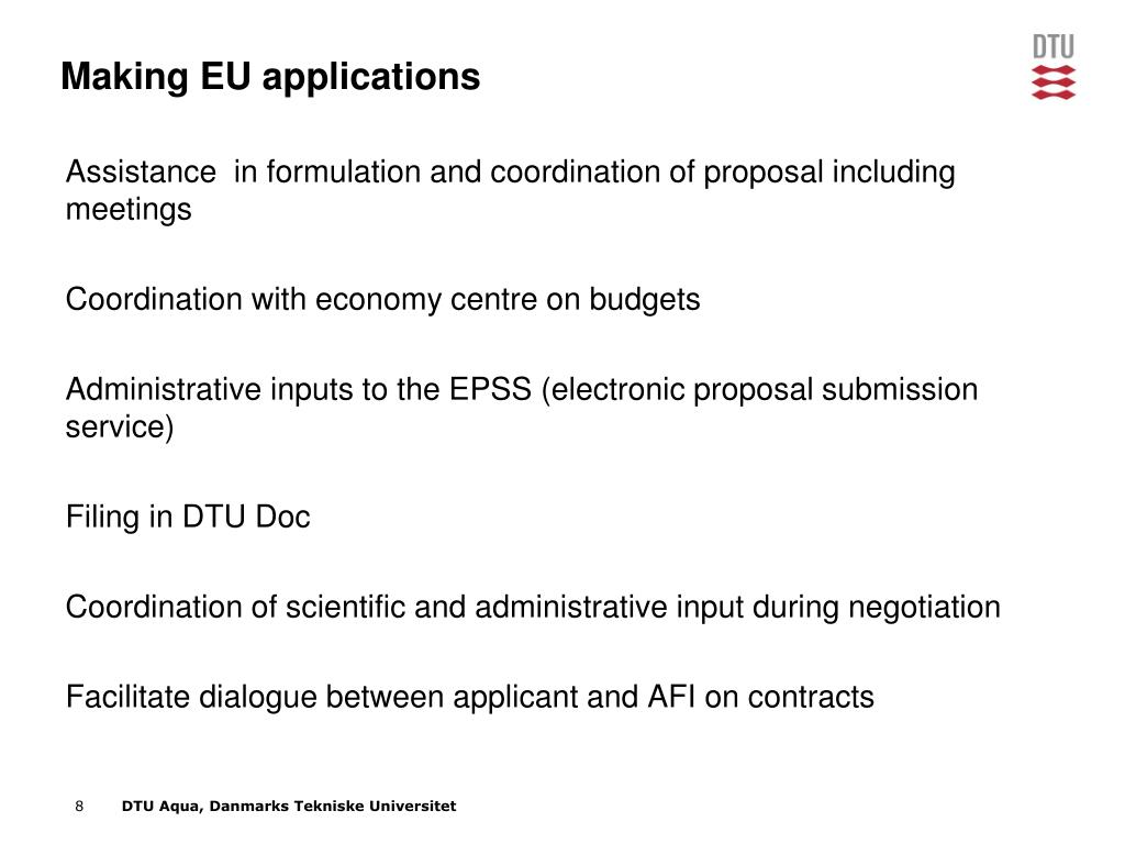 Making EU applications Assistance in formulation and coordination of proposal including meetings Coordination with economy centre on budgets Administrative inputs to the EPSS (electronic proposal submission service) Filing in DTU Doc Coordination of scientific and administrative input during negotiation Facilitate dialogue between applicant and AFI on contracts