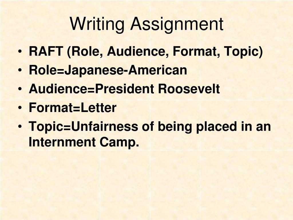 Writing Assignment • RAFT (Role, Audience, Format, Topic) • Role=Japanese-American • Audience=President Roosevelt • Format=Letter • Topic=Unfairness of being placed in an Internment Camp.