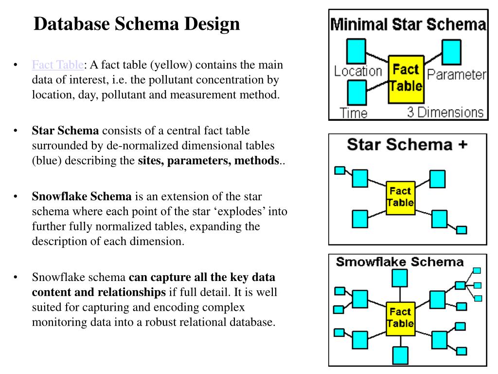 Database Schema Design • Fact Table: A fact table (yellow) contains the main data of interest, i.e. the pollutant concentration by location, day, pollutant and measurement method. • Star Schema consists of a central fact table surrounded by de-normalized dimensional tables (blue) describing the sites, parameters, methods.. • Snowflake Schema is an extension of the star schema where each point of the star ‘explodes’ into further fully normalized tables, expanding the description of each dimension. • Snowflake schema can capture all the key data content and relationships if full detail. It is well suited for capturing and encoding complex monitoring data into a robust relational database.