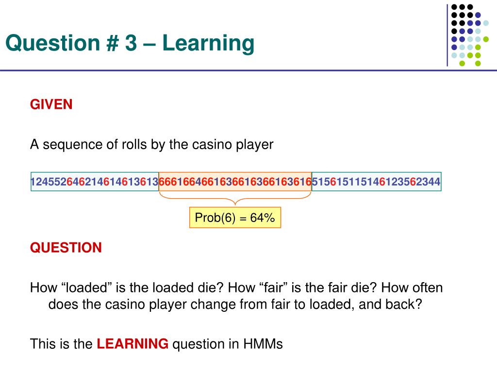 Question # 3 – Learning GIVEN A sequence of rolls by the casino player 1245526462146146136136661664661636616366163616515615115146123562344 QUESTION How “loaded” is the loaded die? How “fair” is the fair die? How often does the casino player change from fair to loaded, and back? This is the LEARNING question in HMMs Prob(6) = 64%