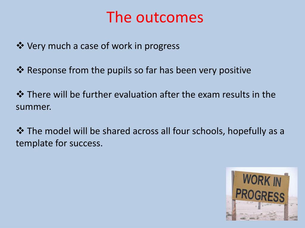 The outcomes • Very much a case of work in progress • Response from the pupils so far has been very positive • There will be further evaluation after the exam results in the summer. • The model will be shared across all four schools, hopefully as a template for success.
