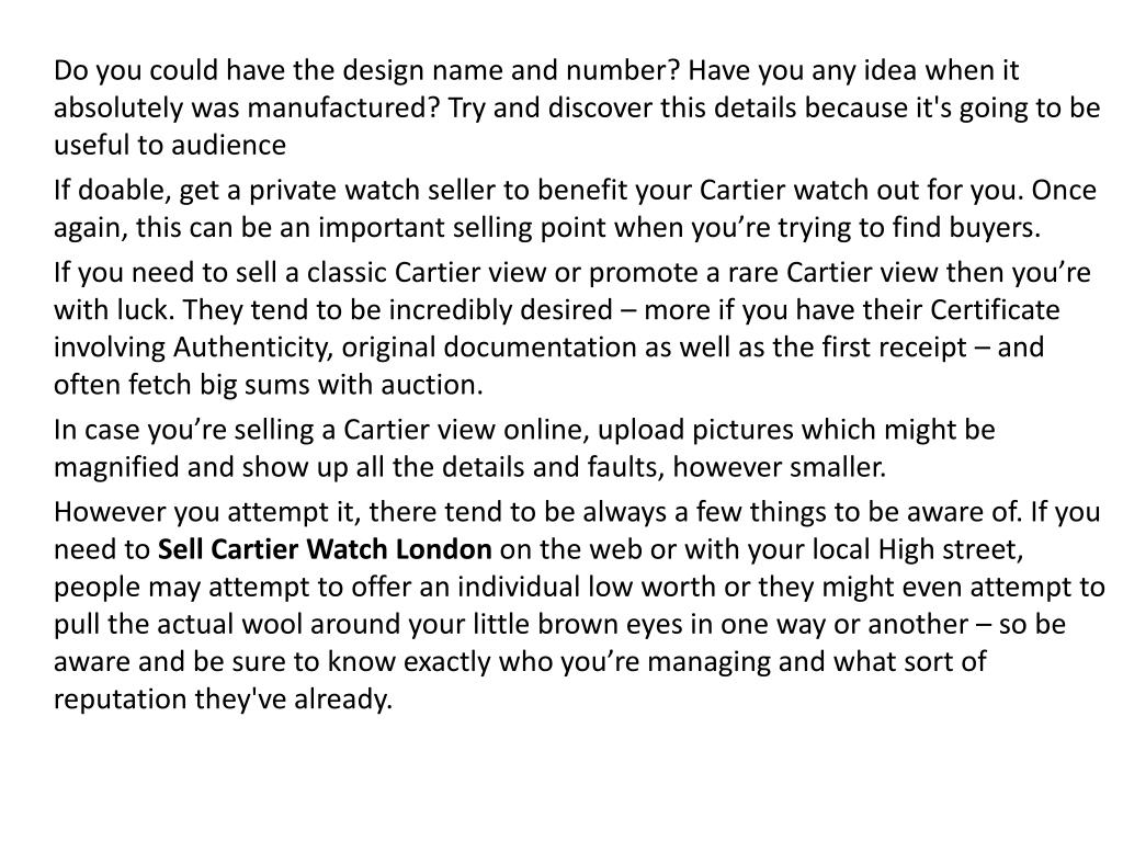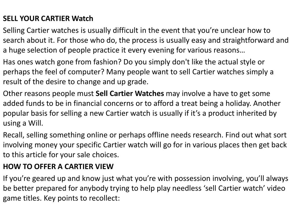 SELL YOUR CARTIER Watch Selling Cartier watches is usually difficult in the event that you’re unclear how to search about it. For those who do, the process is usually easy and straightforward and a huge selection of people practice it every evening for various reasons… Has ones watch gone from fashion? Do you simply don't like the actual style or perhaps the feel of computer? Many people want to sell Cartier watches simply a result of the desire to change and up grade. Other reasons people must Sell Cartier Watches may involve a have to get some added funds to be in financial concerns or to afford a treat being a holiday. Another popular basis for selling a new Cartier watch is usually if it’s a product inherited by using a Will. Recall, selling something online or perhaps offline needs research. Find out what sort involving money your specific Cartier watch will go for in various places then get back to this article for your sale choices. HOW TO OFFER A CARTIER VIEW If you’re geared up and know just what you’re with possession involving, you’ll always be better prepared for anybody trying to help play needless ‘sell Cartier watch’ video game titles. Key points to recollect: