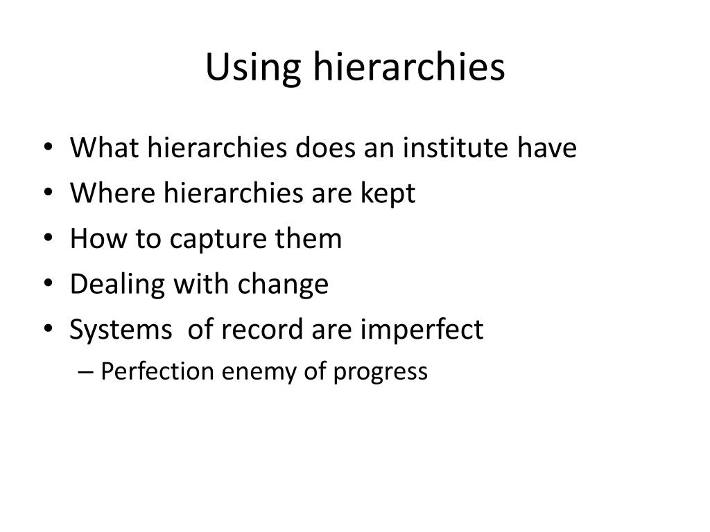 Using hierarchies • What hierarchies does an institute have • Where hierarchies are kept • How to capture them • Dealing with change • Systems of record are imperfect • Perfection enemy of progress