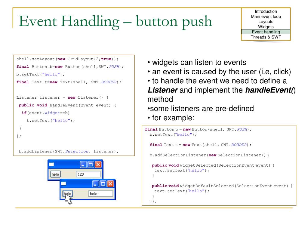 Event Handling – button push shell.setLayout(new GridLayout(2,true)); final Button b=new Button(shell,SWT.PUSH); b.setText("hello"); final Text t=new Text(shell, SWT.BORDER); Listener listener = new Listener() { publicvoid handleEvent(Event event) { if(event.widget==b) t.setText("hello"); } }; b.addListener(SWT.Selection, listener); • widgetscan listen to events • an event is caused by the user (i.e, click) • to handle the event we need to define a Listener and implement the handleEvent() method • some listeners are pre-defined • for example: finalButtonb=newButton(shell,SWT.PUSH);b.setText(“hello");finalTextt=newText(shell,SWT.BORDER);b.addSelectionListener(newSelectionListener(){publicvoidwidgetSelected(SelectionEventevent){text.setText(“hello");}publicvoidwidgetDefaultSelected(SelectionEventevent){text.setText(“hello");}});