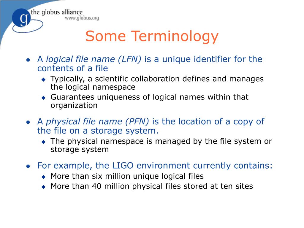 Some Terminology • A logical file name (LFN) is a unique identifier for the contents of a file • Typically, a scientific collaboration defines and manages the logical namespace • Guarantees uniqueness of logical names within that organization • A physical file name (PFN) is the location of a copy of the file on a storage system. • The physical namespace is managed by the file system or storage system • For example, the LIGO environment currently contains: • More than six million unique logical files • More than 40 million physical files stored at ten sites