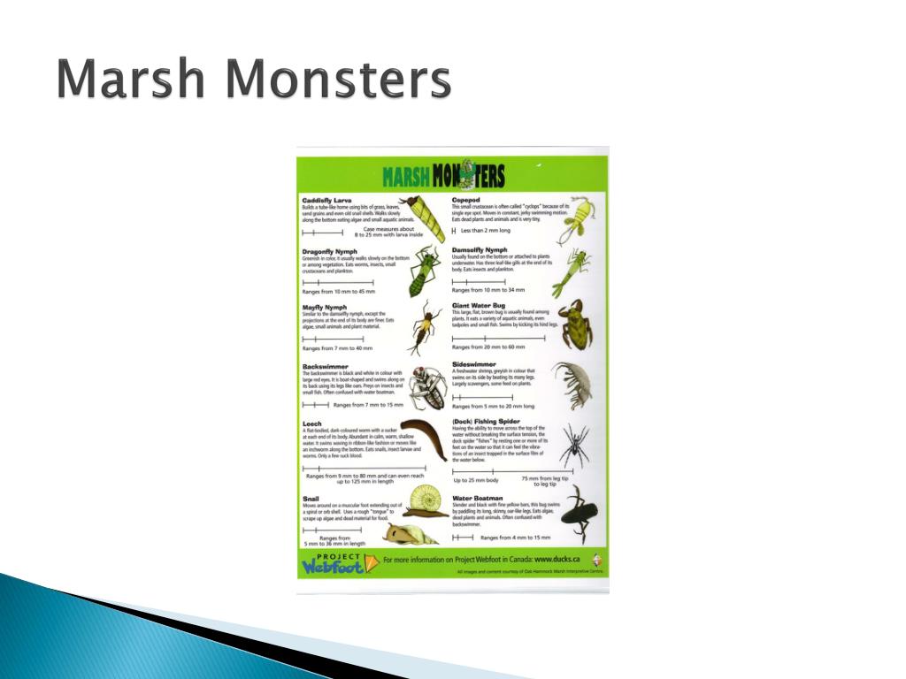 Alive Under the Ice • Information provided to Students • Invertebrates are living things without backbones. • They are an important food source for fish and ducks and other birds. Some do not stay in this state in the spring and summer, they mature into insects. • A Marsh Monster reference sheet was provided at each station.