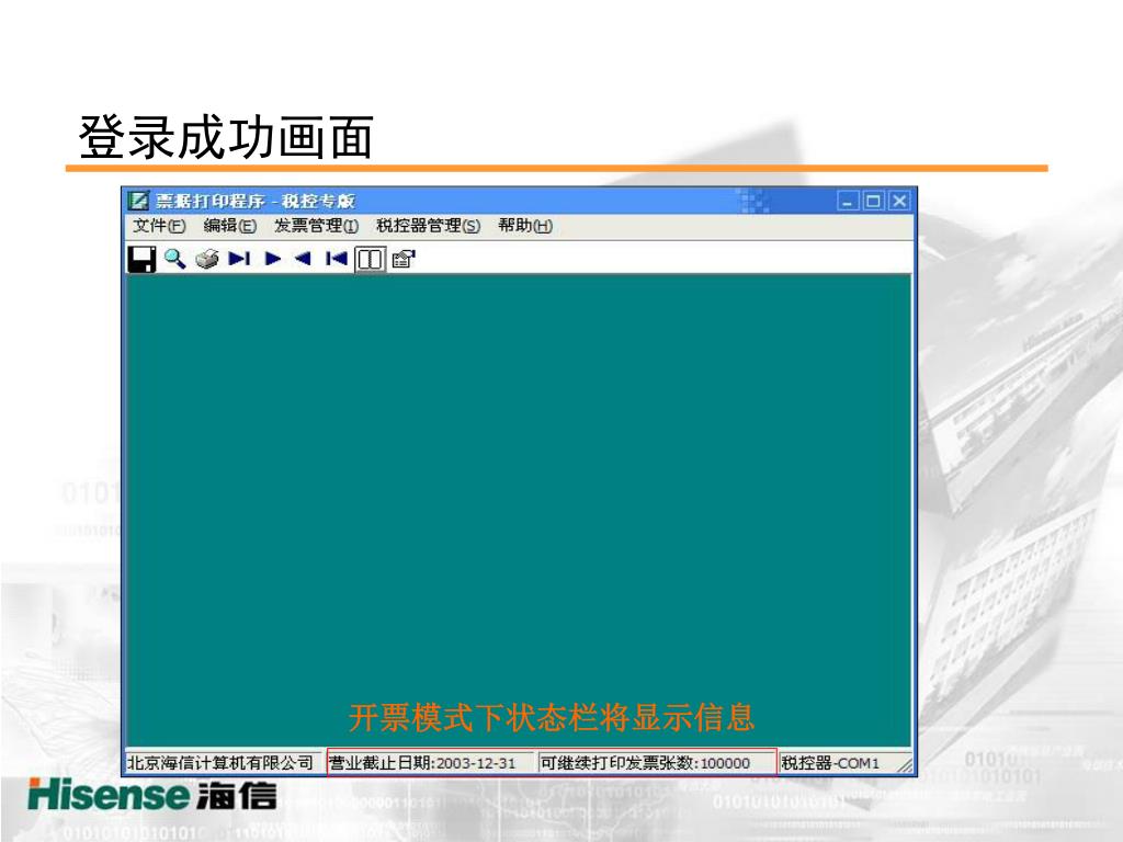 海信税控产品使用手册. 外挂式税控器 北京 北京海信计算机有限公司 2003-06. 重新获得新的授权. 日常开票 不需要插入 IC 卡. 插入 IC 卡 执行 “ 授权 ” 操作. 到达授权期限. 卡中得到新一期授权. 报数成功 获得新一期授权. 插入 IC 卡 执行 “ 报税 ” 操作. 持卡到地税局报数. 使用流程. 软件介绍. 发票领用. 发票打印. 发票打印. 发票查询. 发票管理. 无效发票处理. 软件登录 ( 用户管理 ). 税控器授权. 税控管理. IC 卡报数. 票面位置调整. 其他设置.