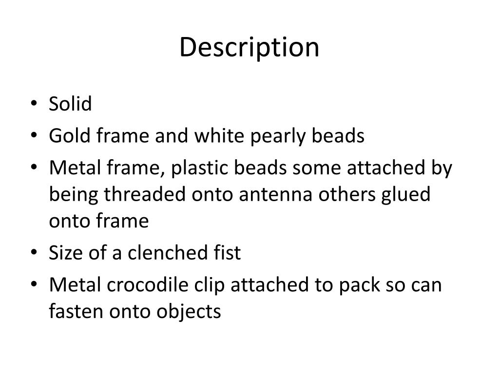 Description • Solid • Gold frame and white pearly beads • Metal frame, plastic beads some attached by being threaded onto antenna others glued onto frame • Size of a clenched fist • Metal crocodile clip attached to pack so can fasten onto objects