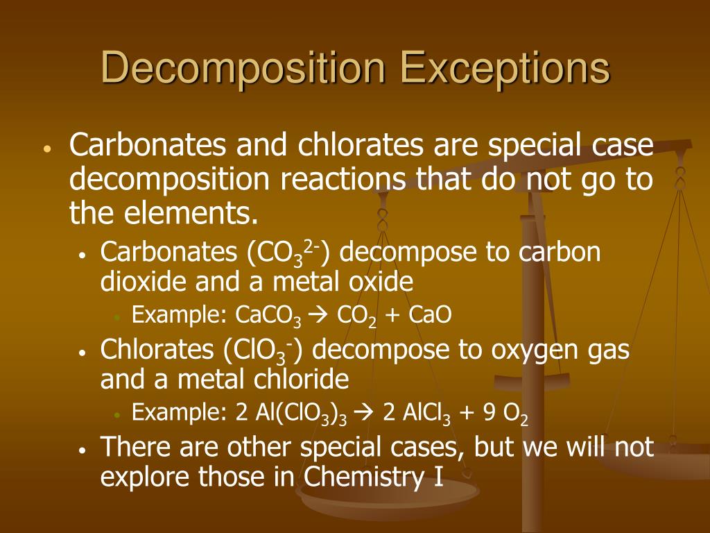 Decomposition Exceptions • Carbonates and chlorates are special case decomposition reactions that do not go to the elements. • Carbonates (CO32-) decompose to carbon dioxide and a metal oxide • Example: CaCO3 CO2 + CaO • Chlorates (ClO3-) decompose to oxygen gas and a metal chloride • Example: 2 Al(ClO3)3 2 AlCl3 + 9 O2 • There are other special cases, but we will not explore those in Chemistry I