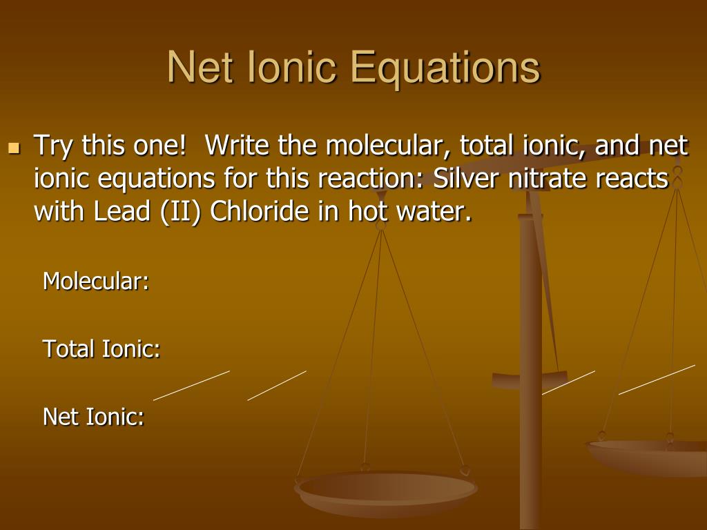 Net Ionic Equations • Try this one! Write the molecular, total ionic, and net ionic equations for this reaction: Silver nitrate reacts with Lead (II) Chloride in hot water. Molecular: Total Ionic: Net Ionic: