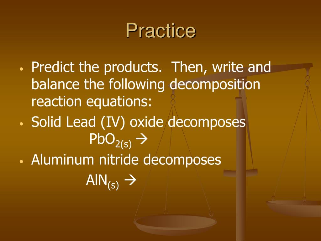 Practice • Predict the products. Then, write and balance the following decomposition reaction equations: • Solid Lead (IV) oxide decomposes PbO2(s) • Aluminum nitride decomposes AlN(s)
