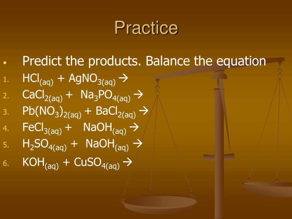 Practice • Predict the products. Balance the equation • HCl(aq) + AgNO3(aq) • CaCl2(aq) + Na3PO4(aq) • Pb(NO3)2(aq) + BaCl2(aq) • FeCl3(aq) + NaOH(aq) • H2SO4(aq) + NaOH(aq) • KOH(aq) + CuSO4(aq)