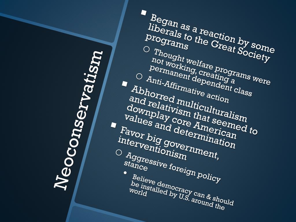 Began as a reaction by some liberals to the Great Society programs • Thought welfare programs were not working, creating a permanent dependent class • Anti-Affirmative action • Abhorred multiculturalism and relativism that seemed to downplay core American values and determination • Favor big government, interventionism • Aggressive foreign policy stance • Believe democracy can & should be installed by U.S. around the world Neoconservatism