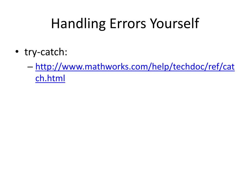 Handling Errors Yourself • try-catch: • http://www.mathworks.com/help/techdoc/ref/catch.html