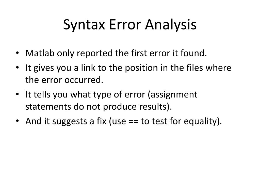Syntax Error Analysis • Matlab only reported the first error it found. • It gives you a link to the position in the files where the error occurred. • It tells you what type of error (assignment statements do not produce results). • And it suggests a fix (use == to test for equality).