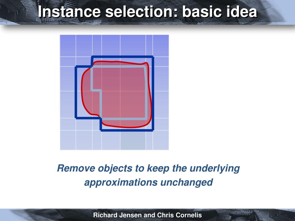 Instance selection: basic idea Not needed Remove objects to keep the underlying approximations unchanged