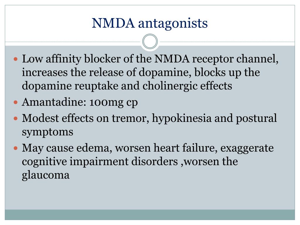 NMDA antagonists Low affinity blocker of the NMDA receptor channel, increases the release of dopamine, blocks up the dopamine reuptake and cholinergic effects Amantadine: 100mg cp Modest effects on tremor, hypokinesia and postural symptoms May cause edema, worsen heart failure, exaggerate cognitive impairment disorders ,worsen the glaucoma