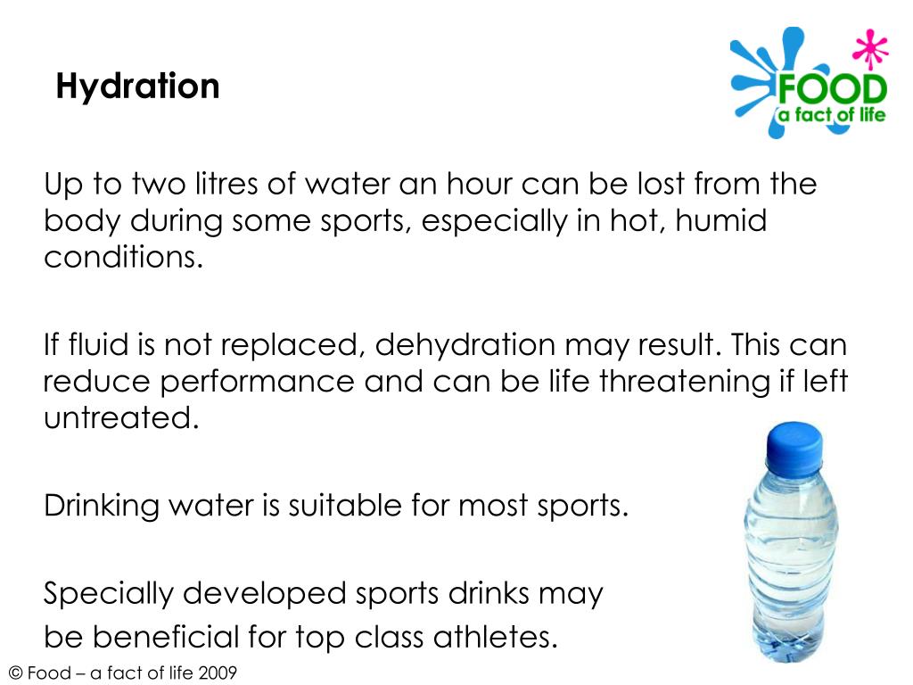 Hydration Up to two litres of water an hour can be lost from the body during some sports, especially in hot, humid conditions. If fluid is not replaced, dehydration may result. This can reduce performance and can be life threatening if left untreated. Drinking water is suitable for most sports. Specially developed sports drinks may be beneficial for top class athletes.