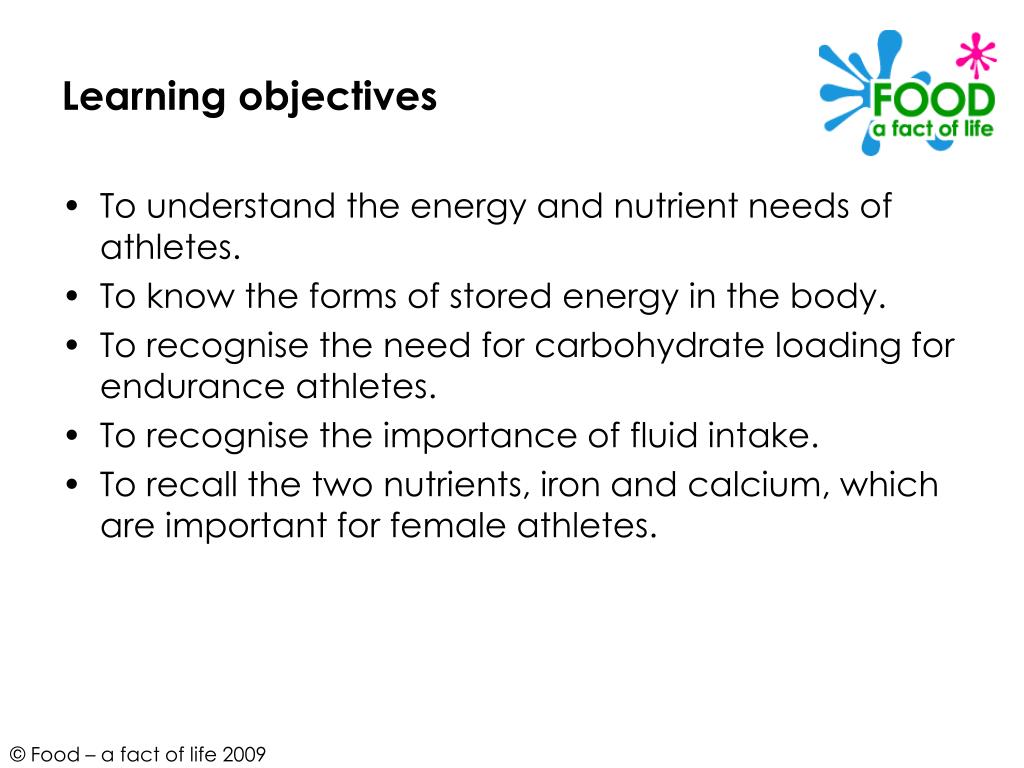 Learning objectives • To understand the energy and nutrient needs of athletes. • To know the forms of stored energy in the body. • To recognise the need for carbohydrate loading for endurance athletes. • To recognise the importance of fluid intake. • To recall the two nutrients, iron and calcium, which are important for female athletes.