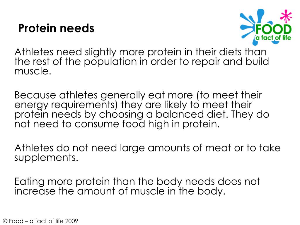 Protein needs Athletes need slightly more protein in their diets than the rest of the population in order to repair and build muscle. Because athletes generally eat more (to meet their energy requirements) they are likely to meet their protein needs by choosing a balanced diet. They do not need to consume food high in protein. Athletes do not need large amounts of meat or to take supplements. Eating more protein than the body needs does not increase the amount of muscle in the body.