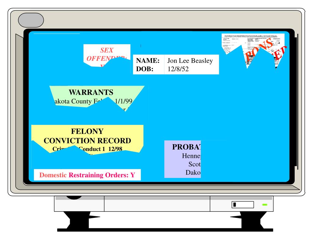 criMNet SEX OFFENDER: YES WEAPONS PROHIBITED NAME: DOB: Jon Lee Beasley 12/8/52 WARRANTS Dakota County Felony 1/1/99 Hennepin County Misdemeanor 2/5/99 Carver County Gross Msdr 5/5/99 MISDEMEANORS Domestic Assault 3/3/97 Assault 2/15/94 DWI 7/4/93 DWI 9/15/92 PRE-TRIAL RELEASE Ramsey 11/99 Hennepin 6/99 Dakota 5/99 FELONY CONVICTION RECORD Crim Sex Conduct 1 12/98 Assault with Weapon 3/96 Burglary Occupied 6/94 JUVENILE FELONY RECORD YES PROBATION Hennepin Scott Dakota DomesticRestraining Orders: Y