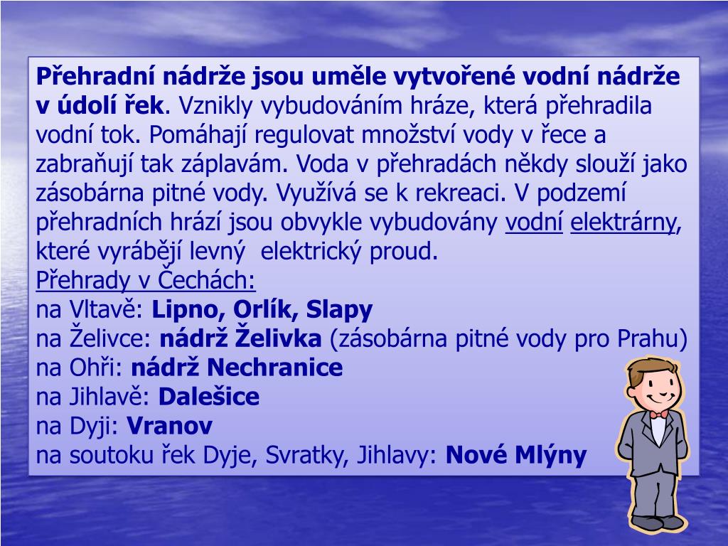 Přehradní nádrže jsou uměle vytvořené vodní nádrže v údolí řek. Vznikly vybudováním hráze, která přehradila vodní tok. Pomáhají regulovat množství vody v řece a zabraňují tak záplavám. Voda v přehradách někdy slouží jako zásobárna pitné vody. Využívá se k rekreaci. V podzemí přehradních hrází jsou obvykle vybudovány vodníelektrárny, které vyrábějí levný elektrický proud. Přehrady v Čechách: na Vltavě: Lipno, Orlík, Slapy na Želivce: nádrž Želivka(zásobárna pitné vody pro Prahu) na Ohři: nádrž Nechranice na Jihlavě: Dalešice na Dyji: Vranov na soutoku řek Dyje, Svratky, Jihlavy: Nové Mlýny