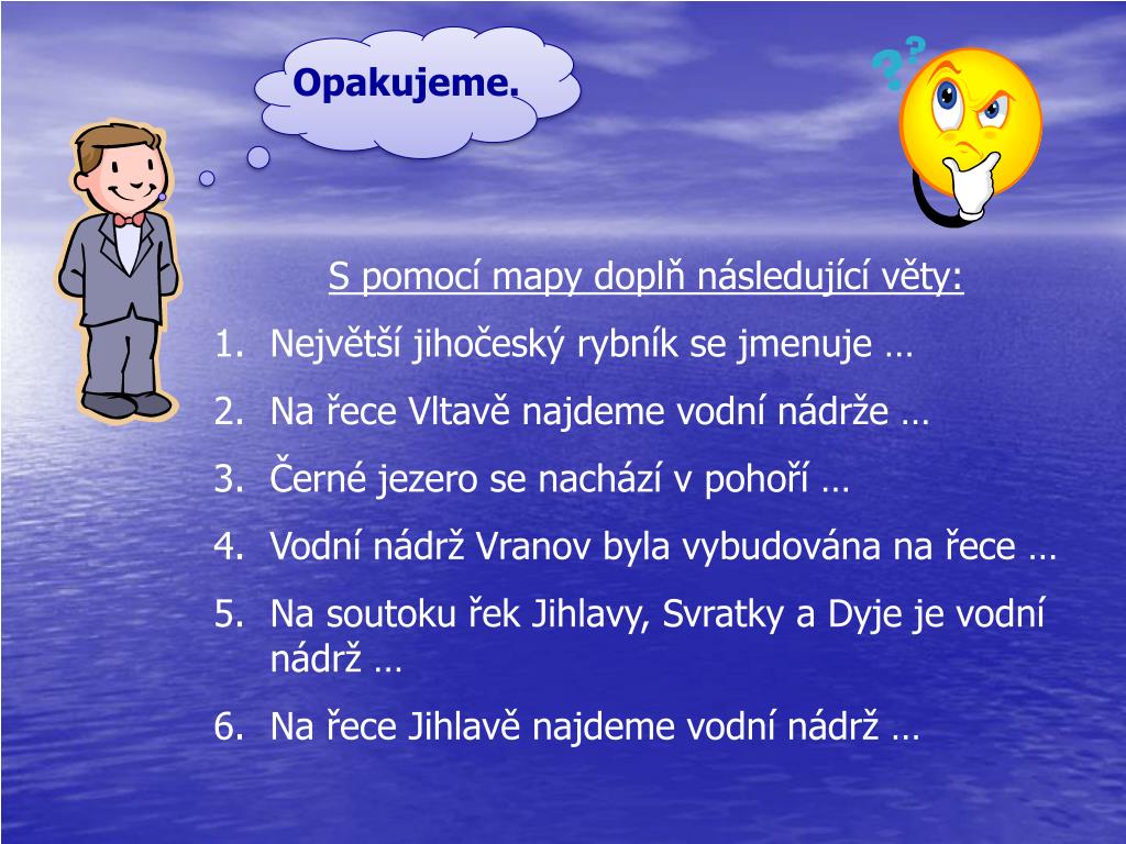 Opakujeme. • S pomocí mapy doplň následující věty: • Největší jihočeský rybník se jmenuje … • Na řece Vltavě najdeme vodní nádrže … • Černé jezero se nachází v pohoří … • Vodní nádrž Vranov byla vybudována na řece … • Na soutoku řek Jihlavy, Svratky a Dyje je vodní nádrž … • Na řece Jihlavě najdeme vodní nádrž …