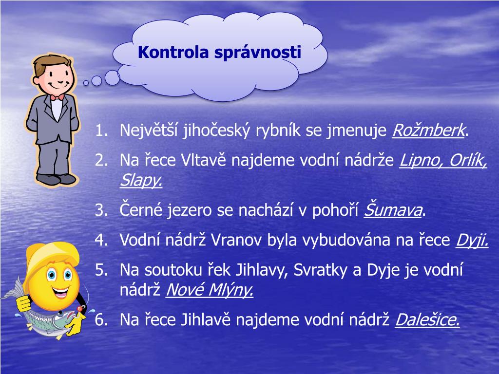Kontrola správnosti • Největší jihočeský rybník se jmenuje Rožmberk. • Na řece Vltavě najdeme vodní nádrže Lipno, Orlík, Slapy. • Černé jezero se nachází v pohoří Šumava. • Vodní nádrž Vranov byla vybudována na řece Dyji. • Na soutoku řek Jihlavy, Svratky a Dyje je vodní nádrž Nové Mlýny. • Na řece Jihlavě najdeme vodní nádrž Dalešice.