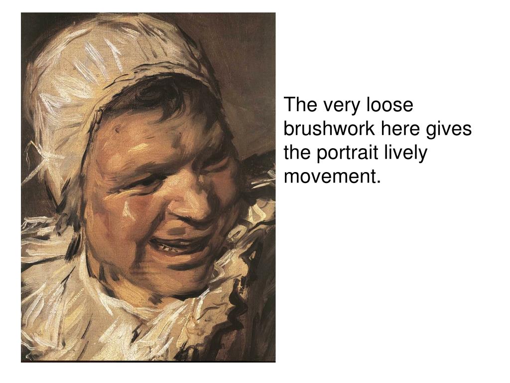 Hals, the Portrait Painter • Hals was a portrait painter, who preferred to paint laughing, informal pictures of people. • He used quick, dashing brushstrokes to give his works a fresh, just-finished look. His portraits are so successful in capturing a fleeting expression that they look like candid photographs. (Mittler. Art in Focus)