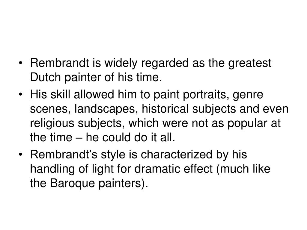 Rembrandt is widely regarded as the greatest Dutch painter of his time. • His skill allowed him to paint portraits, genre scenes, landscapes, historical subjects and even religious subjects, which were not as popular at the time – he could do it all. • Rembrandt’s style is characterized by his handling of light for dramatic effect (much like the Baroque painters).