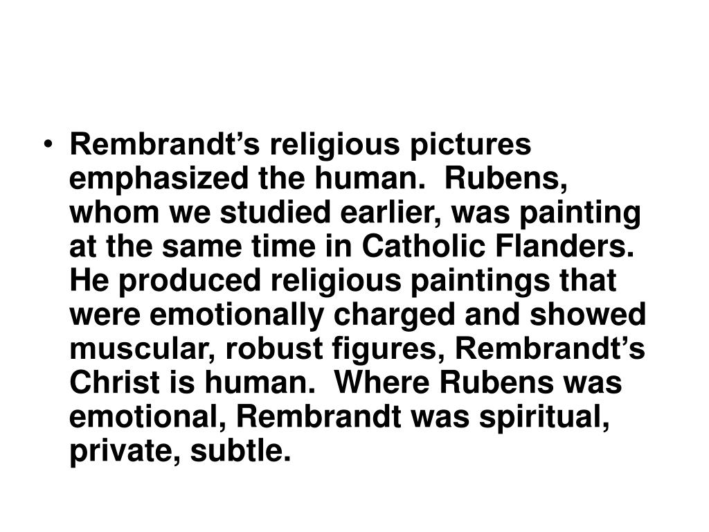 Rembrandt’s religious pictures emphasized the human. Rubens, whom we studied earlier, was painting at the same time in Catholic Flanders. He produced religious paintings that were emotionally charged and showed muscular, robust figures, Rembrandt’s Christ is human. Where Rubens was emotional, Rembrandt was spiritual, private, subtle.