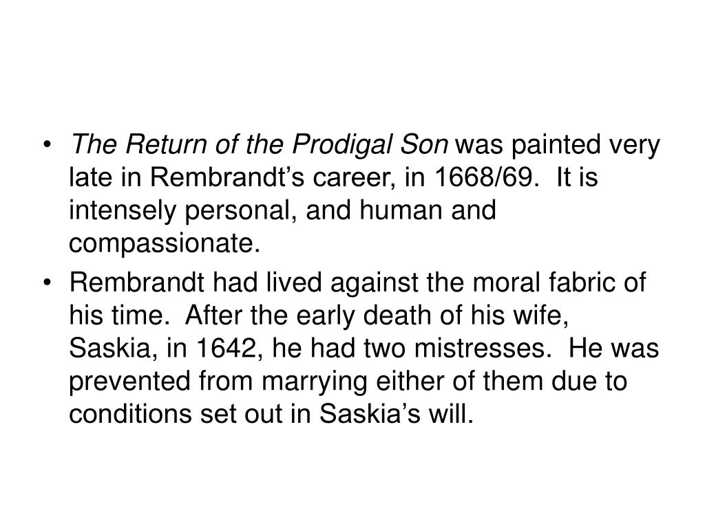 The Return of the Prodigal Son was painted very late in Rembrandt’s career, in 1668/69. It is intensely personal, and human and compassionate. • Rembrandt had lived against the moral fabric of his time. After the early death of his wife, Saskia, in 1642, he had two mistresses. He was prevented from marrying either of them due to conditions set out in Saskia’s will.