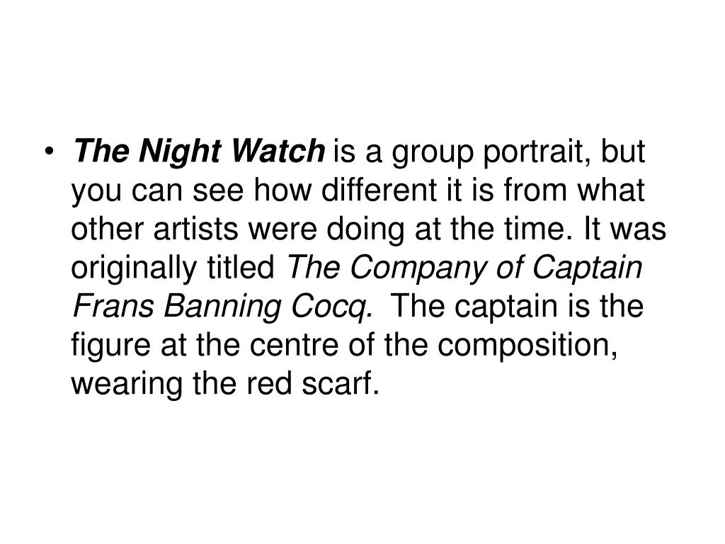 The Night Watch is a group portrait, but you can see how different it is from what other artists were doing at the time. It was originally titled The Company of Captain Frans Banning Cocq. The captain is the figure at the centre of the composition, wearing the red scarf.