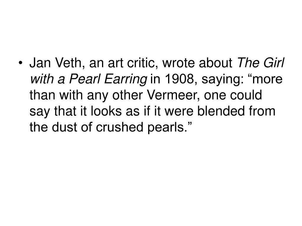 Jan Veth, an art critic, wrote about The Girl with a Pearl Earring in 1908, saying: “more than with any other Vermeer, one could say that it looks as if it were blended from the dust of crushed pearls.”