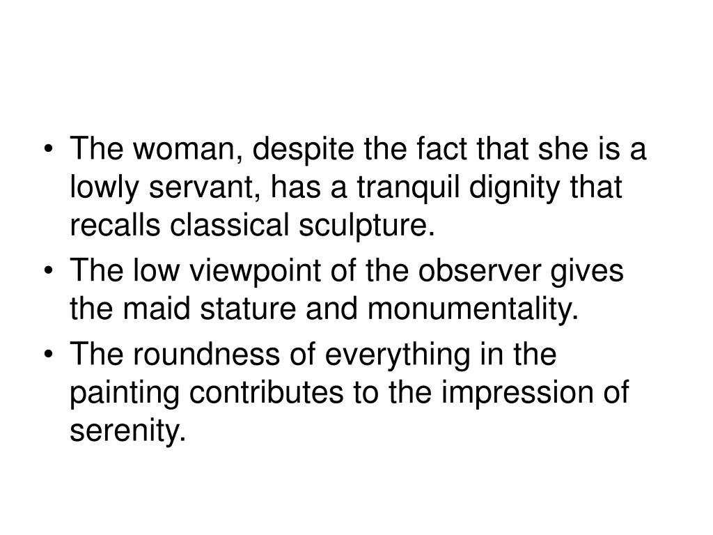 The woman, despite the fact that she is a lowly servant, has a tranquil dignity that recalls classical sculpture. • The low viewpoint of the observer gives the maid stature and monumentality. • The roundness of everything in the painting contributes to the impression of serenity.