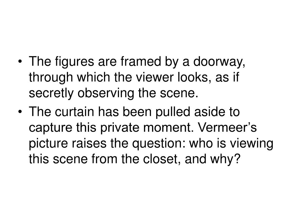 The figures are framed by a doorway, through which the viewer looks, as if secretly observing the scene. • The curtain has been pulled aside to capture this private moment. Vermeer’s picture raises the question: who is viewing this scene from the closet, and why?
