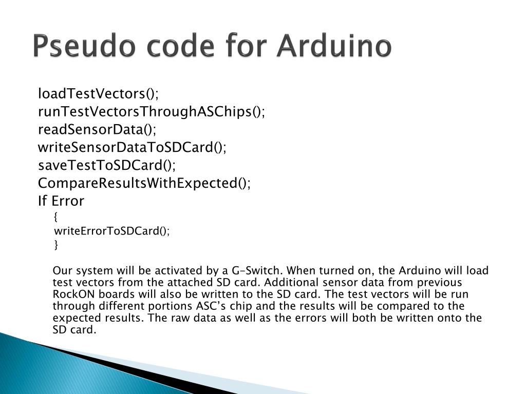Pseudo code for Arduino loadTestVectors(); runTestVectorsThroughASChips(); readSensorData(); writeSensorDataToSDCard(); saveTestToSDCard(); CompareResultsWithExpected(); If Error { writeErrorToSDCard(); } Our system will be activated by a G-Switch. When turned on, the Arduino will load test vectors from the attached SD card. Additional sensor data from previous RockON boards will also be written to the SD card. The test vectors will be run through different portions ASC’s chip and the results will be compared to the expected results. The raw data as well as the errors will both be written onto the SD card.