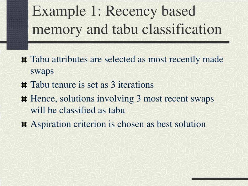 Example 1: Recency based memory and tabu classification • Tabu attributes are selected as most recently made swaps • Tabu tenure is set as 3 iterations • Hence, solutions involving 3 most recent swaps will be classified as tabu • Aspiration criterion is chosen as best solution