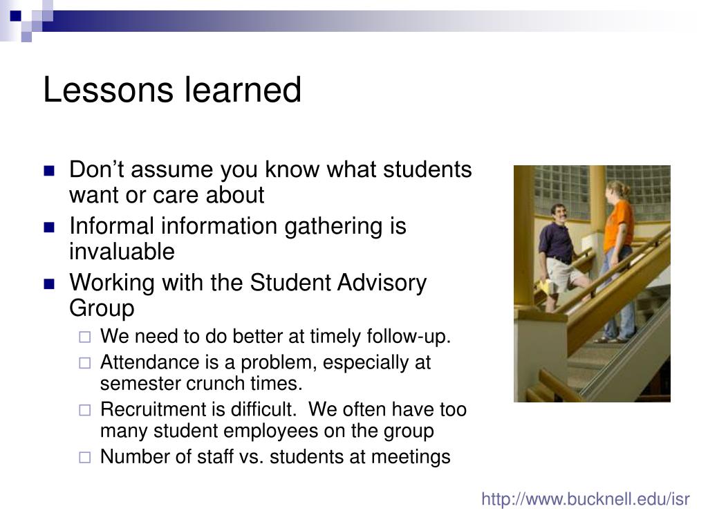 Lessons learned • Don’t assume you know what students want or care about • Informal information gathering is invaluable • Working with the Student Advisory Group • We need to do better at timely follow-up. • Attendance is a problem, especially at semester crunch times. • Recruitment is difficult. We often have too many student employees on the group • Number of staff vs. students at meetings