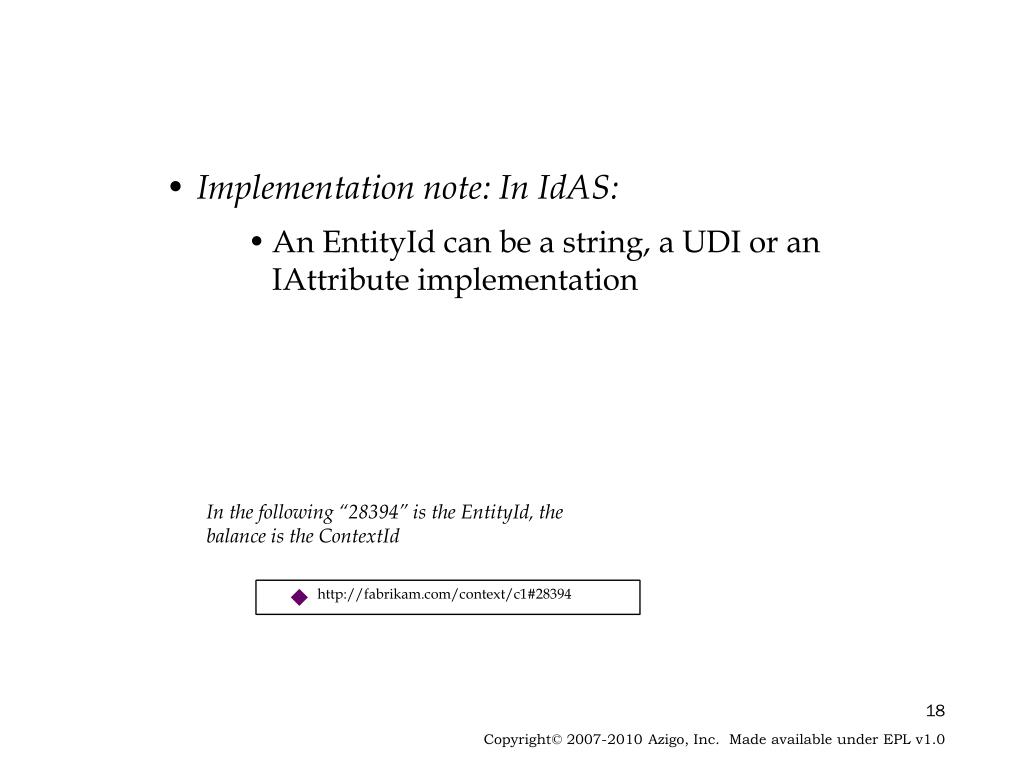 Implementation note: In IdAS: • An EntityId can be a string, a UDI or an IAttribute implementation In the following “28394” is the EntityId, the balance is the ContextId http://fabrikam.com/context/c1#28394