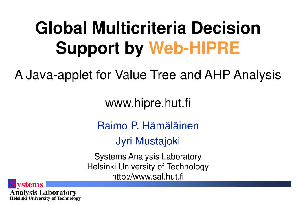 Global Multicriteria Decision Support by Web-HIPREA Java-applet for Value Tree and AHP Analysis www.hipre.hut.fi Raimo P. Hämäläinen Jyri Mustajoki Systems Analysis Laboratory Helsinki University of Technology http://www.sal.hut.fi