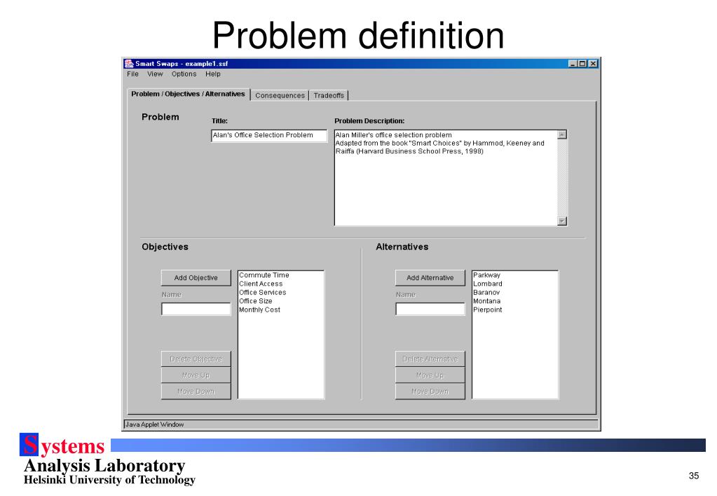 Opinions-Online (www.opinions.hut.fi) • Platform for global participation, voting, surveys, and group decisions Web-HIPRE (www.hipre.hut.fi) • Value tree based decision analysis and support WINPRE andPRIME Decisions (for Windows) • Interval AHP, interval SMART/SWING and PRIME methods RICH Decisions (www.rich.hut.fi) • Preference programming in MAVT Smart-Swaps (www.smart-swaps.hut.fi) • Multicriteria decision support with the even swaps method Joint Gains (www.jointgains.hut.fi) • Negotiation support with the method of improving directions