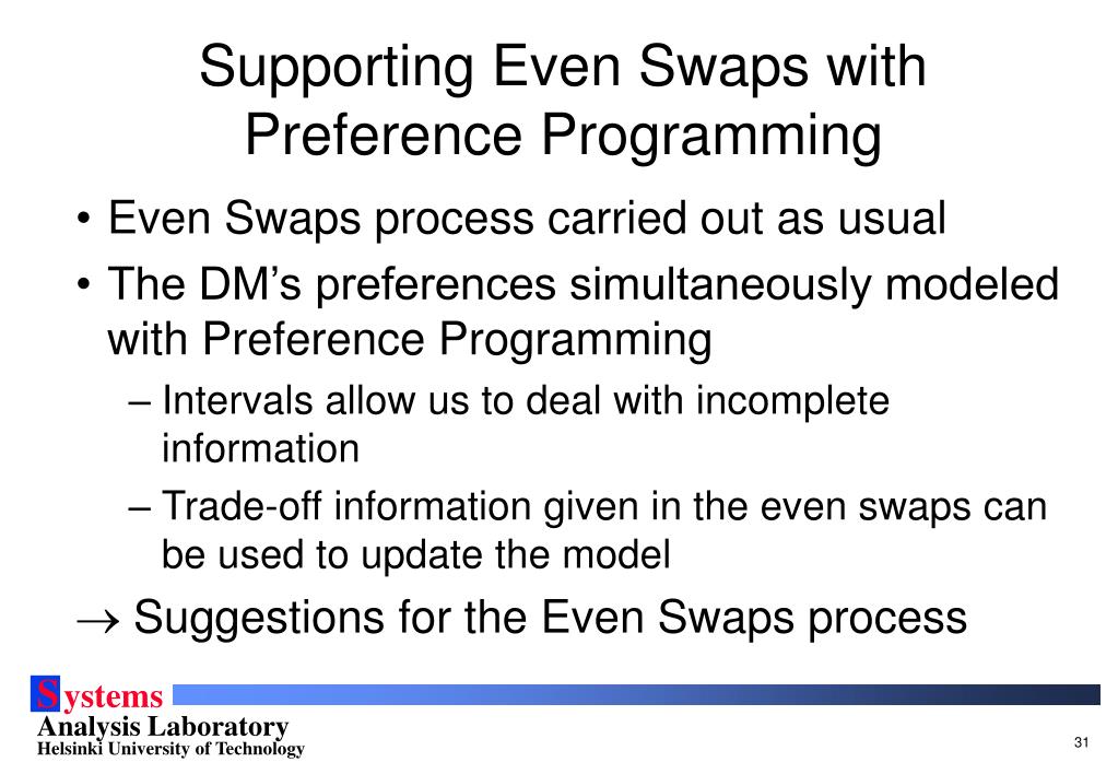 Preference Programming Even Swaps Updating of the model Problem initialization Initial statements about the attributes Practical dominance candidates Eliminate dominated alternatives Eliminate irrelevant attributes No More than one remaining alternative Yes Even swap suggestions Make an even swap Trade-off information The most preferred alternative is found Decision support