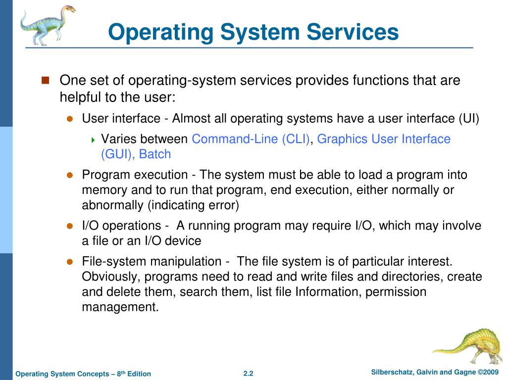 Operating System Services • One set of operating-system services provides functions that are helpful to the user: • User interface - Almost all operating systems have a user interface (UI) • Varies between Command-Line (CLI), Graphics User Interface (GUI), Batch • Program execution - The system must be able to load a program into memory and to run that program, end execution, either normally or abnormally (indicating error) • I/O operations - A running program may require I/O, which may involve a file or an I/O device • File-system manipulation - The file system is of particular interest. Obviously, programs need to read and write files and directories, create and delete them, search them, list file Information, permission management.