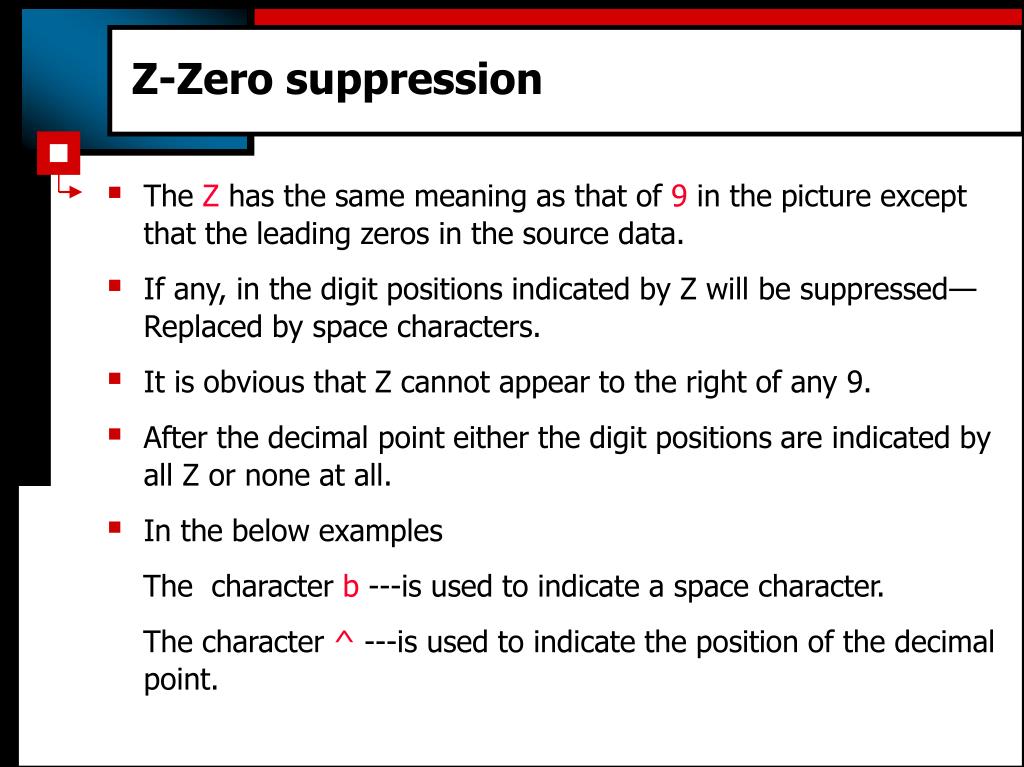 Z-Zero suppression • The Z has the same meaning as that of 9 in the picture except that the leading zeros in the source data. • If any, in the digit positions indicated by Z will be suppressed—Replaced by space characters. • It is obvious that Z cannot appear to the right of any 9. • After the decimal point either the digit positions are indicated by all Z or none at all. • In the below examples The character b ---is used to indicate a space character. The character ^ ---is used to indicate the position of the decimal point.
