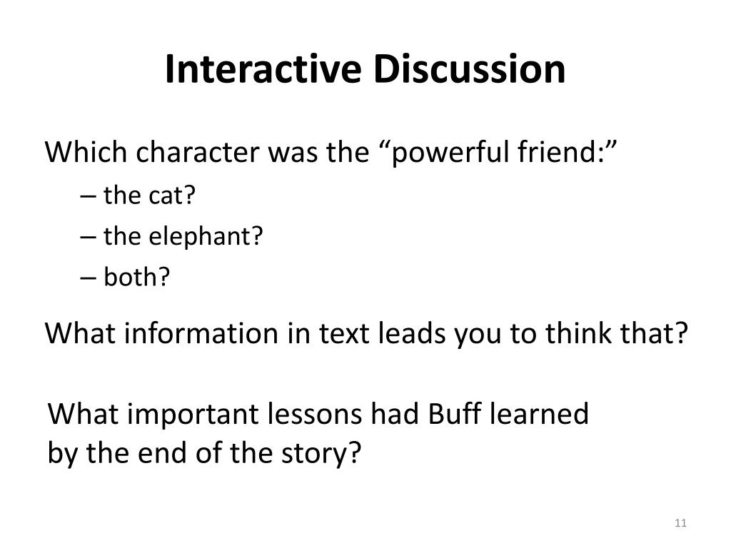 Interactive Discussion Which character was the “powerful friend:” • the cat? • the elephant? • both? What information in text leads you to think that? What important lessons had Buff learned by the end of the story?