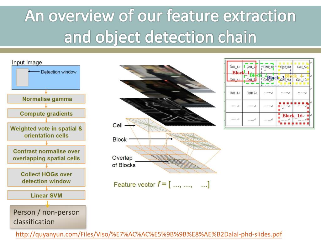 An overview of our feature extraction and object detection chain Person / non-person classification http://quyanyun.com/Files/Viso/%E7%AC%AC%E5%9B%9B%E8%AE%B2Dalal-phd-slides.pdf