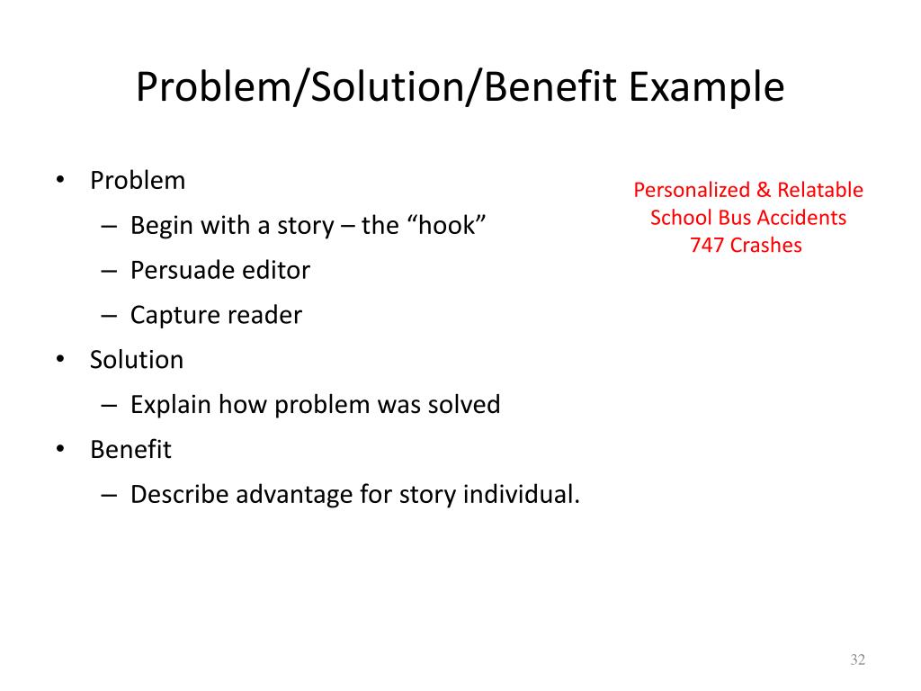 Problem/Solution/Benefit Example • Problem • Begin with a story – the “hook” • Persuade editor • Capture reader • Solution • Explain how problem was solved • Benefit • Describe advantage for story individual. Personalized & Relatable School Bus Accidents 747 Crashes