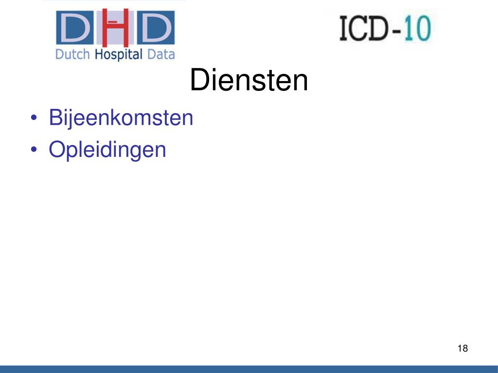 Producten • ICD-10 boek • ICD-10 in verschillende formats • ICD-10 NL app • Conversielijst van ICD-9 naar ICD-10 en van ICD-10 naar ICD-9 • Betekenisvolle lijsten • Trainingtool • Landelijk implementatieplan